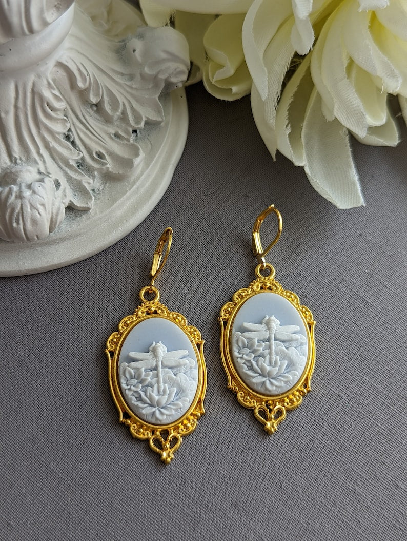 These beautifully detailed Dragonfly cameo earrings are wonderful statement earrings.