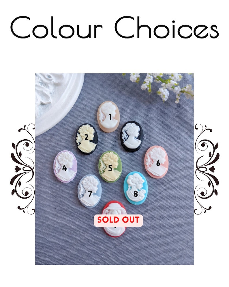 - Material: acrylic cameos, antiqued brass, faux pearls (glass)