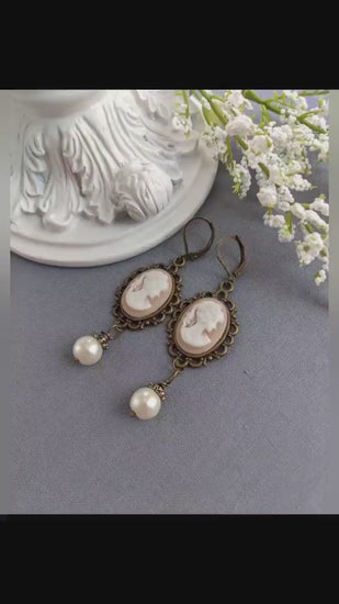 Peach Cameo Pearl Drop Earrings – Victorian Style Antiqued Brass Jewelry