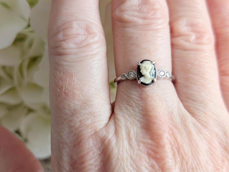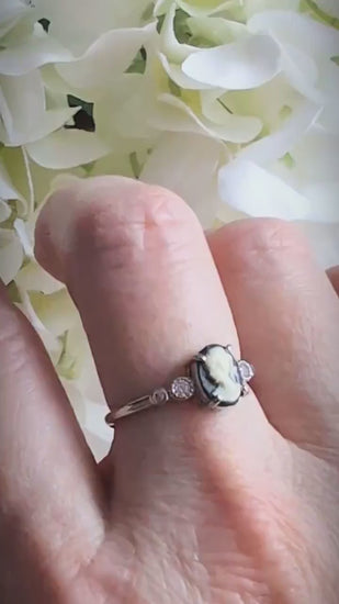 At its heart rests a classic ivory-on-black lady silhouette cameo, which I carefully selected and hand-set into the setting in my Toronto studio. The shoulders are accented with two white cubic zirconias on each side, adding a graceful shimmer that frames the cameo beautifully.