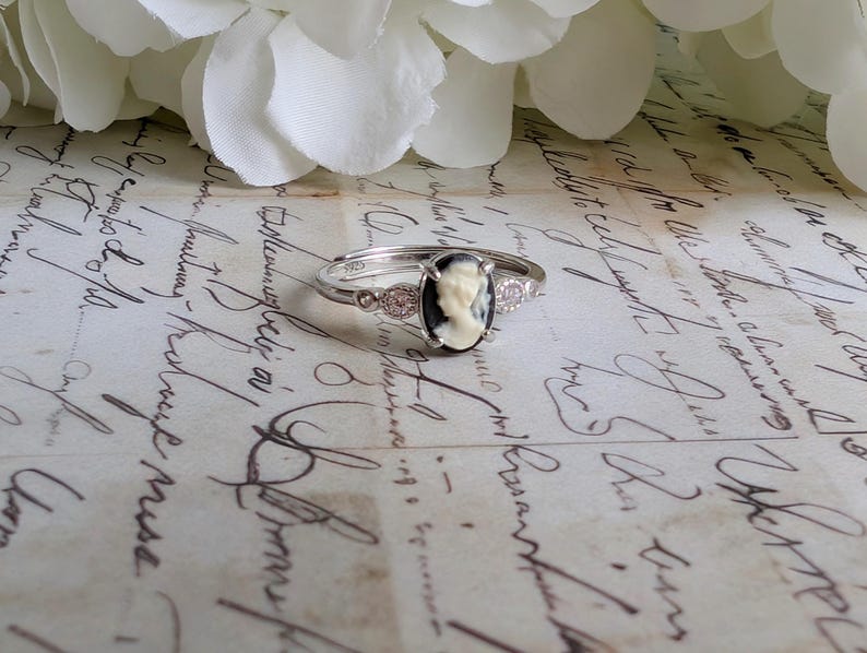 This stunning 925 sterling silver cameo ring is a timeless design that blends vintage charm with a subtle touch of sparkle.