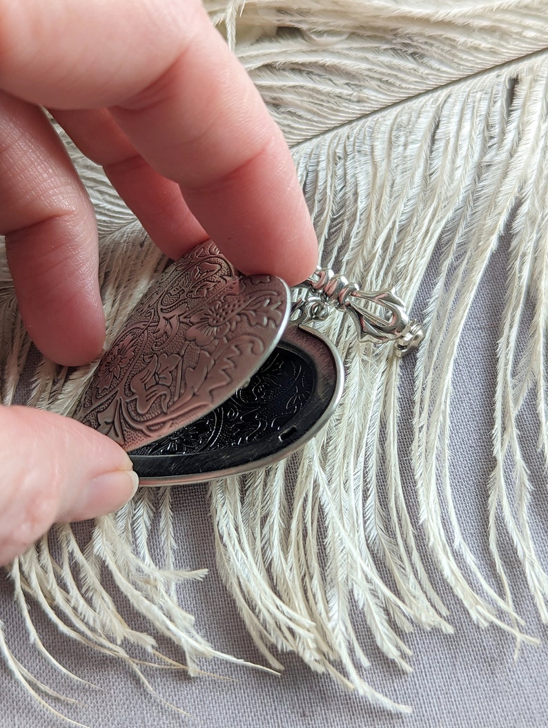 Size: The locket is 1 1/2" (38mm) long and 1 1/2" (38mm) wide. It is silver-plated brass. The brooch pin mechanism is a horizontal twist lock style.