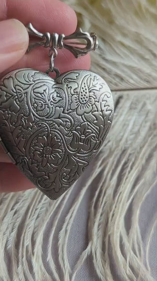 This heart locket brooch features an embossed floral design on both sides of the locket pendant.