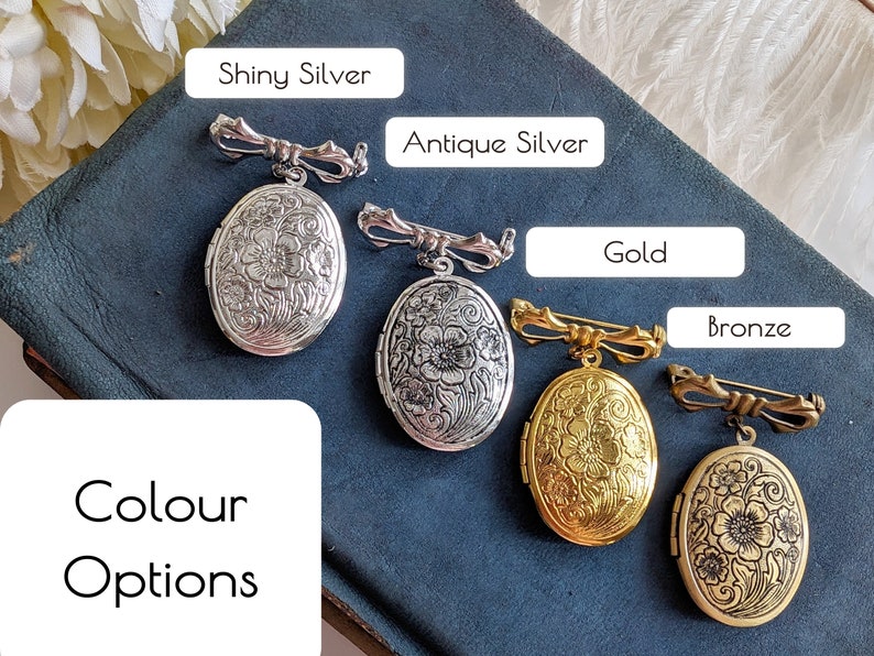 Size: The locket is 1 1/4" (32mm) long and 1" (25mm) wide. The interior spaces to hold photos are 23mm long and 17mm wide. It is silver-plated brass. The brooch pin mechanism is a horizontal twist lock style.