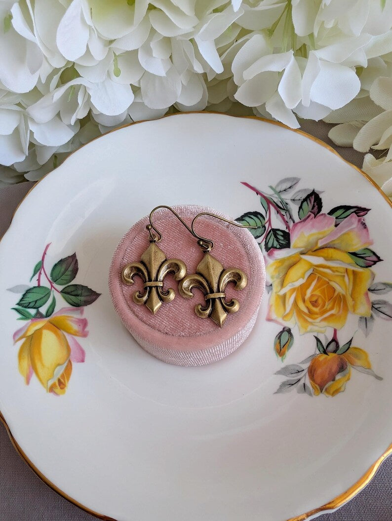 Celebrate your love for all things French with these beautifully crafted Fleur de Lis earrings, available in in antiqued brass finish. Perfect for adding a touch of Victorian-inspired elegance to your everyday look or for gifting to someone special.