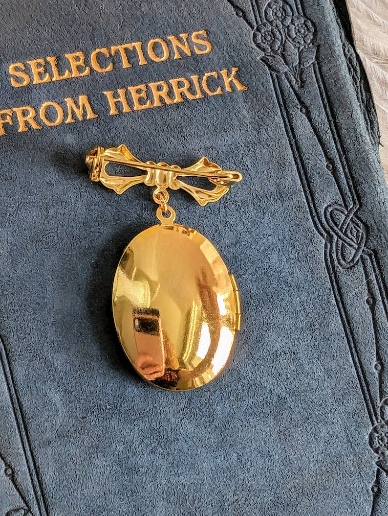 Size: The locket is 1 1/4" (32mm) long and 1" (25mm) wide. It is gold-plated brass. The interior spaces to hold photos are 23mm long and 17mm wide. The brooch pin mechanism is a horizontal twist lock style.