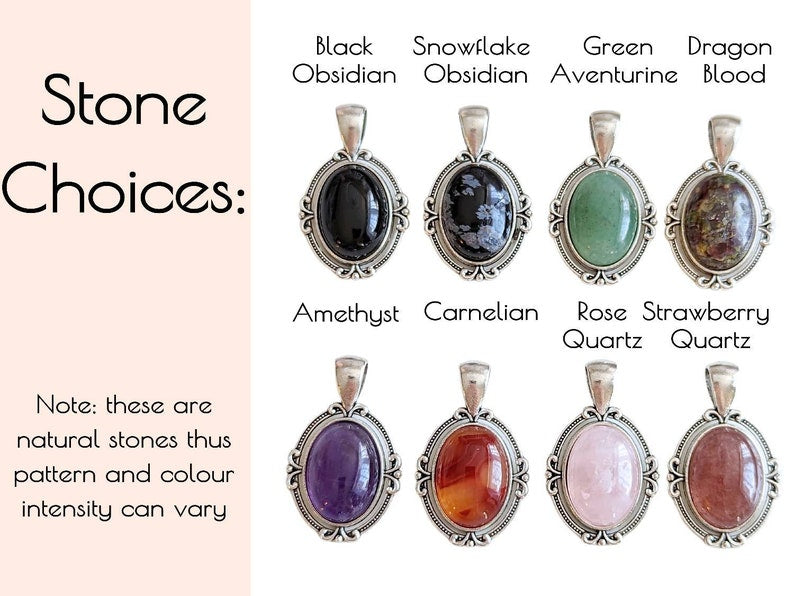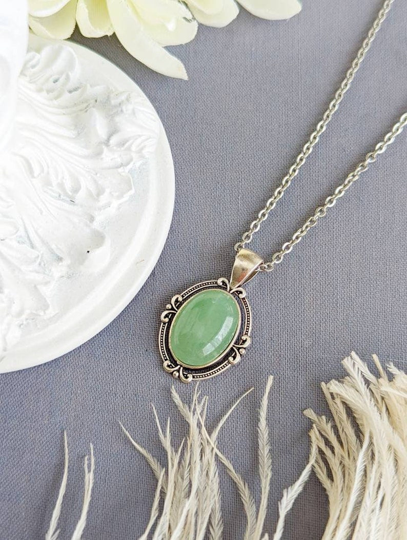 Handmade in my studio, this aventurine necklace features a gleaming green aventurine cabochon set in an elegant oval pendant with vintage-inspired flourish detailing. The earthy green stone paired with an antiqued silver finish creates a timeless, quietly dramatic look that’s easy to wear every day or dress up.
