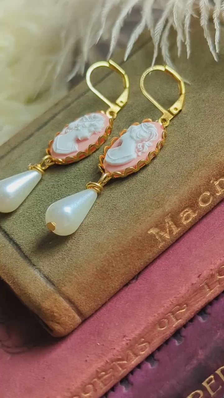 Handmade Pink Cameo Pearl Earrings | Victorian Romantic Jewelry