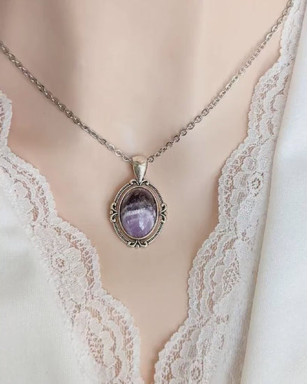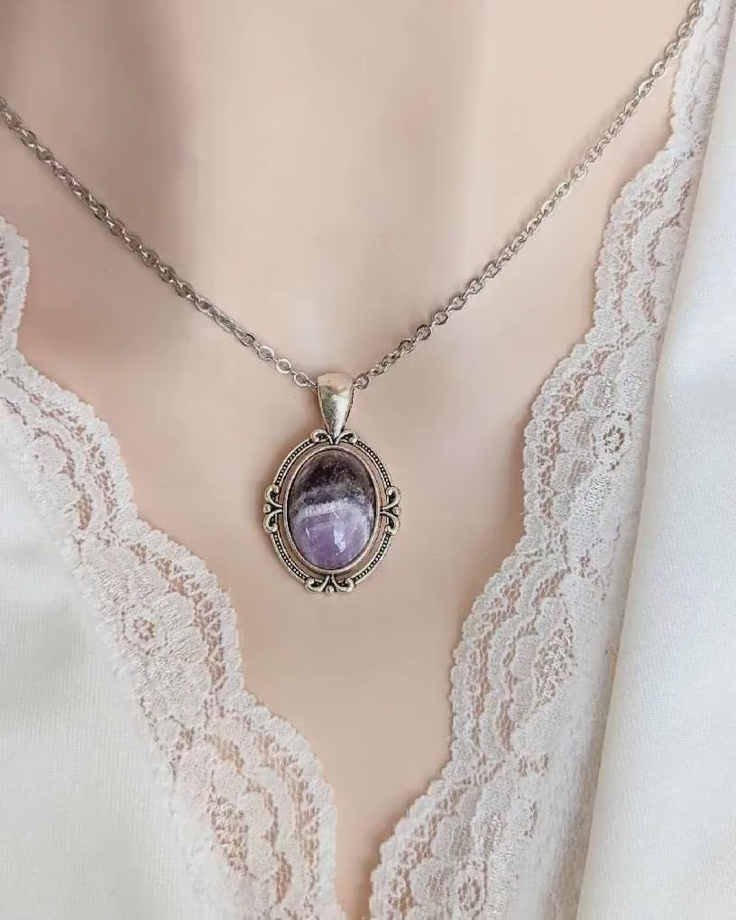 This Amethyst necklace is handmade by me in my Toronto studio. I carefully selected each polished purple cabochon to pair with a vintage-inspired silver-plated pendant featuring delicate flourish details that showcase the stone’s natural variations. Some stones are uniform in color, while others display rich multi-tone patterns; you can request a preference if desired.