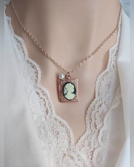 Rose Gold Book Locket Necklace: Cameo & Pearl, Book Lover Gift