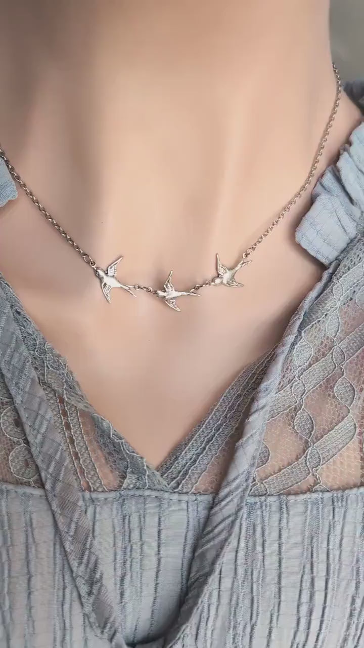 Celebrate the eternal bond of love and unity with our exquisite swallow necklace, a symbol of devotion, freedom, and companionship. This stunning piece features three graceful Swallows soaring in a row.