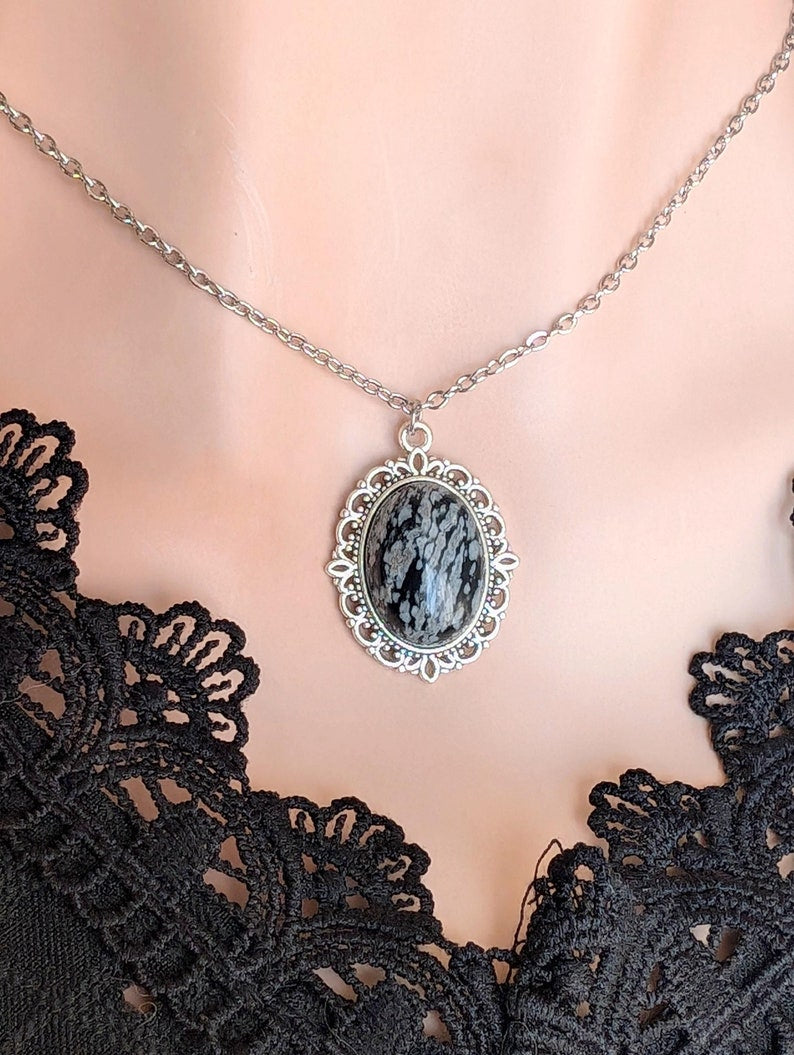 Snowflake Obsidian Necklace, Gothic Vintage Crystal Pendant Jewelry