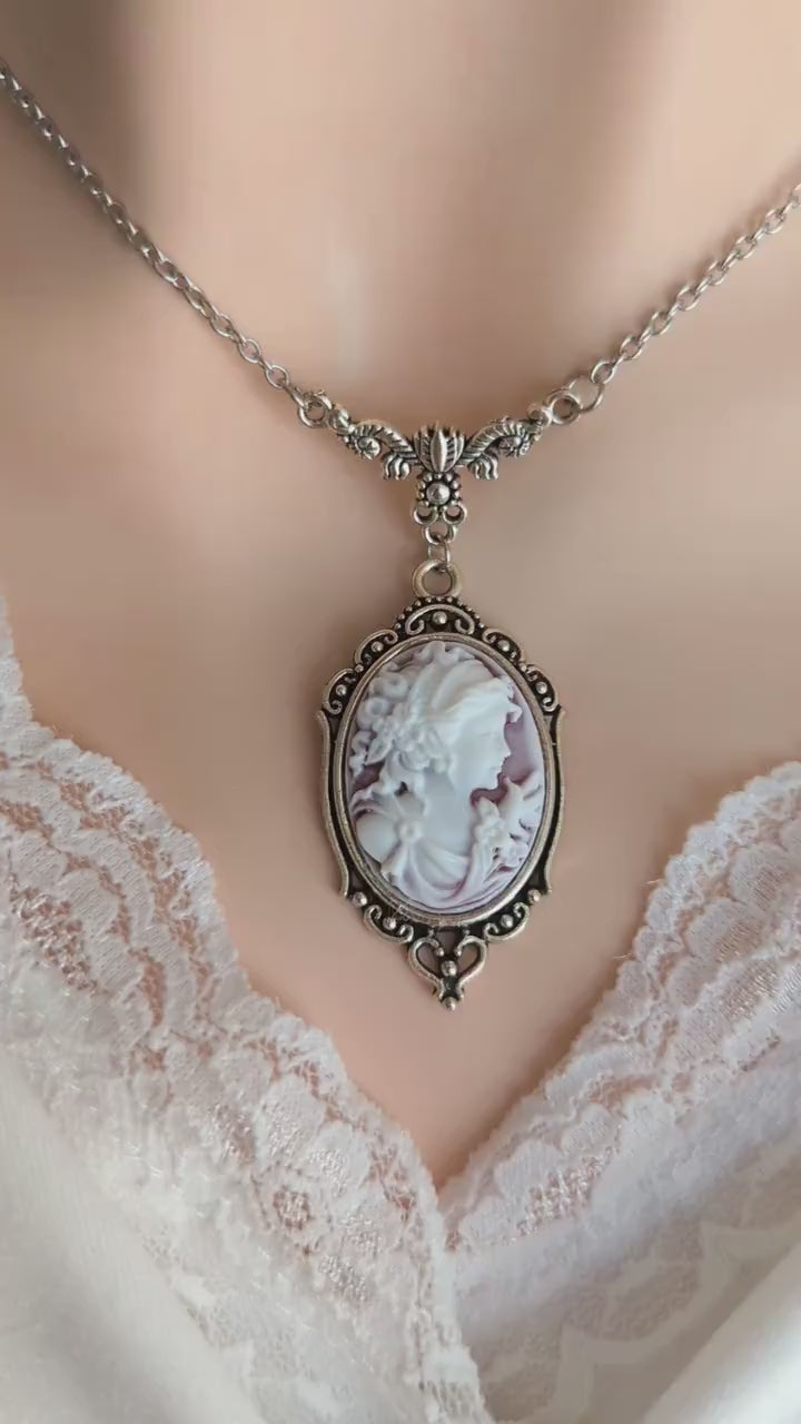 Victorian Goddess Cameo Necklace, Antique Silver Wedding Jewelry