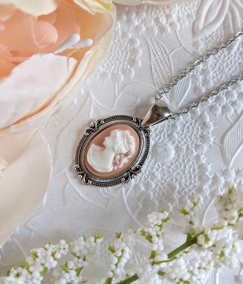 This necklace has vintage Victorian vibes and features an elegant cameo pendant with lovely flourish designs on the vintage-style silver setting.