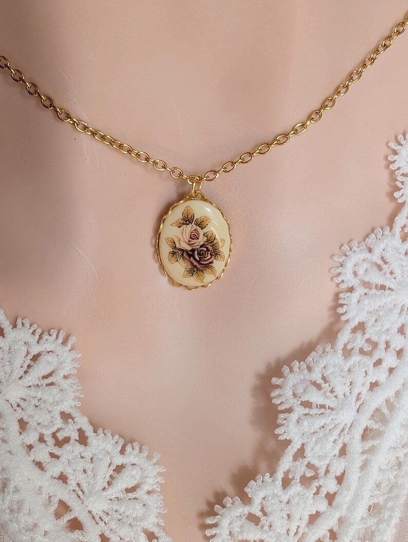 This vintage-inspired necklace is a delicate tribute to timeless floral beauty. At its heart is a lace-edged oval drop pendant holding an ivory-coloured Limoges-style cabochon adorned with two roses - one a delicate pink, the other a faded-burgundy. The pendant is suspended from a delicate cable-style chain.