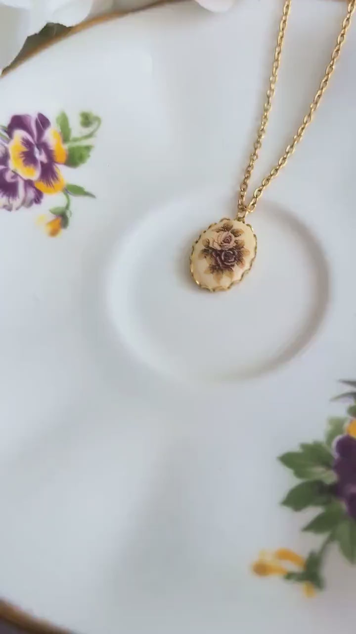 Vintage Rose Necklace, Pink and Gold Cameo Pendant, Floral Jewelry