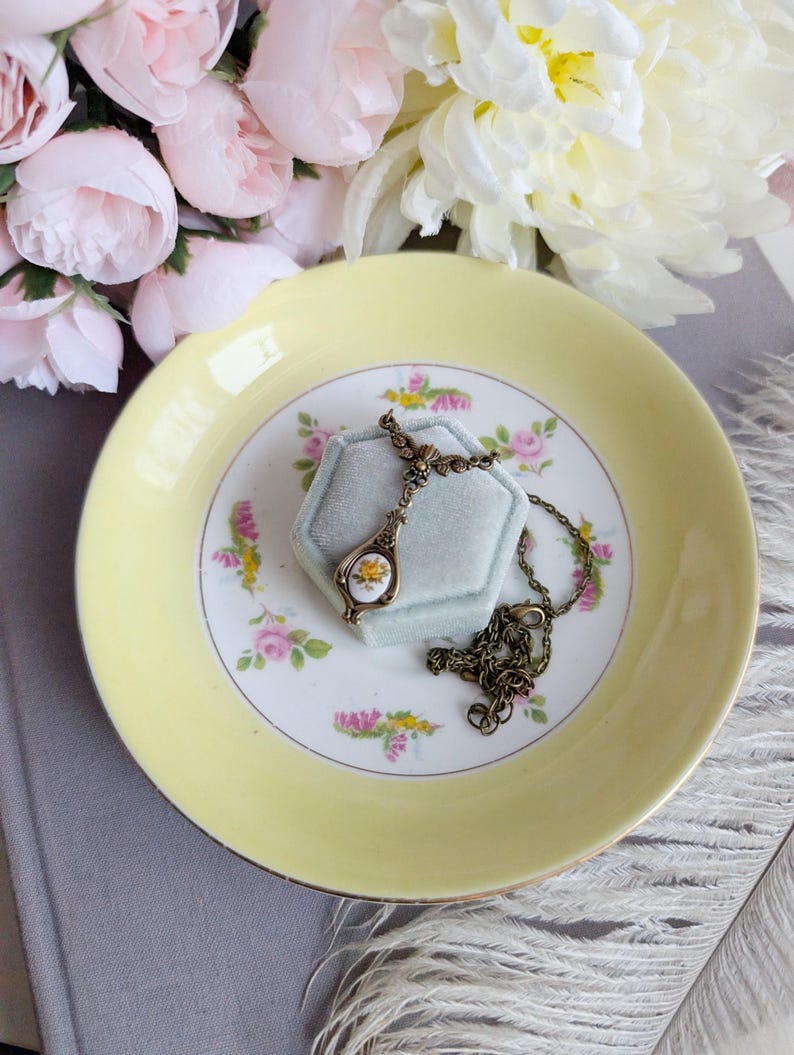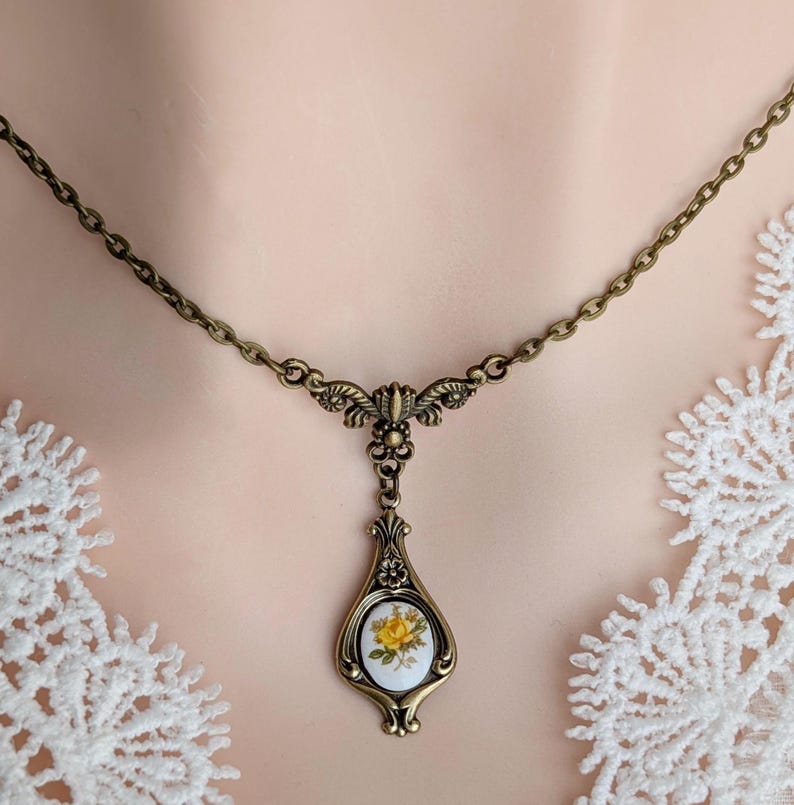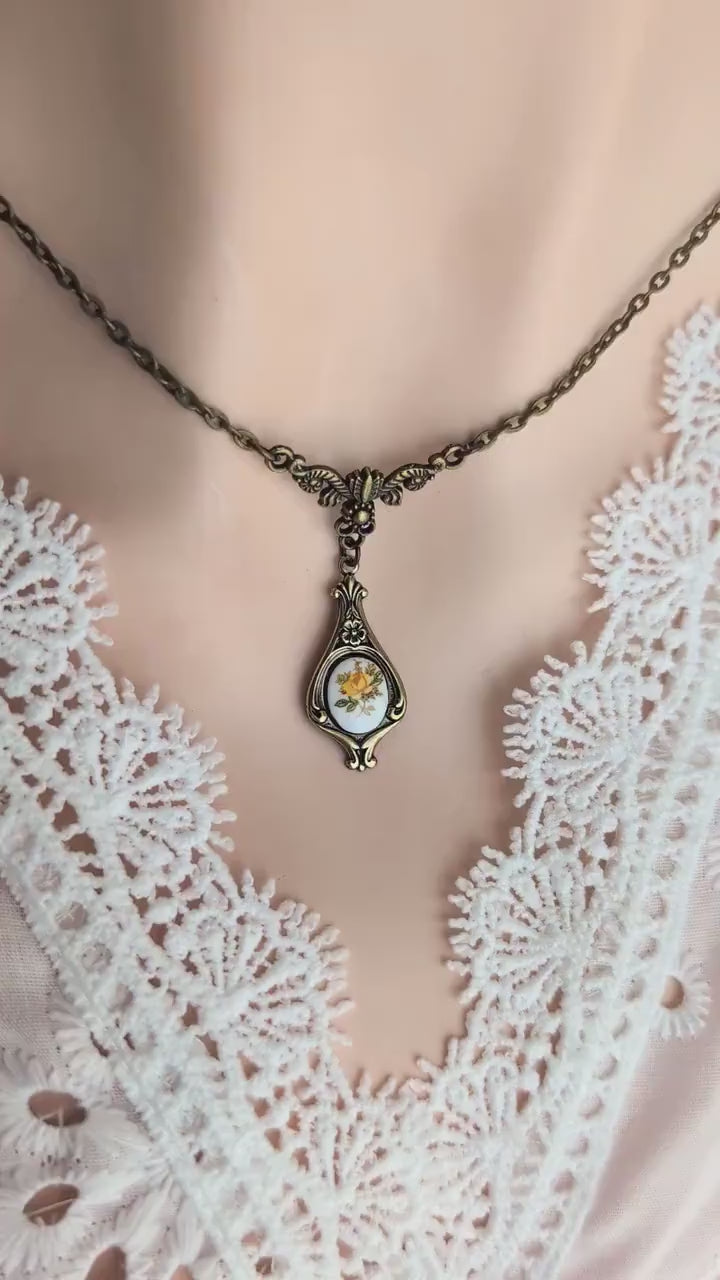 This vintage-inspired necklace is a delicate tribute to timeless floral beauty. At its heart is a curved drop pendant with a nod to Art Nouveau's graceful botanical detailing, holding a Limoges-style cabochon adorned with a soft yellow rose. The pendant is suspended from a beautiful antiqued bronze tulip connector that adds an elegant, organic touch.